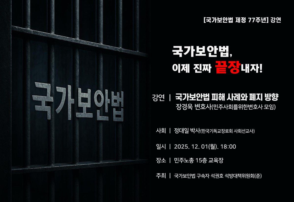 [국가보안법 제정 77주년] 강연(장경욱 변호사) 국가보안법, 이제 진짜 끝장내자! 2025년 11월 24일 노정협 국가보안법, 이제 진짜 끝장내자! 강연 | 국가보안법 피해 사례와 폐지 방향 강사 | 장경욱 변호사(민주사회를위한변호사 모임) 사회 | 정대일 박사(한국기독교장로회 사회선교사) 일시 | 2025. 12. 01(월). 18:00 장소 | 민주노총 15층 교육장 주최 | 국가보안법 구속자 석권호 석방대책위원회(준) 이 기사를 총 3번 보았습니다.