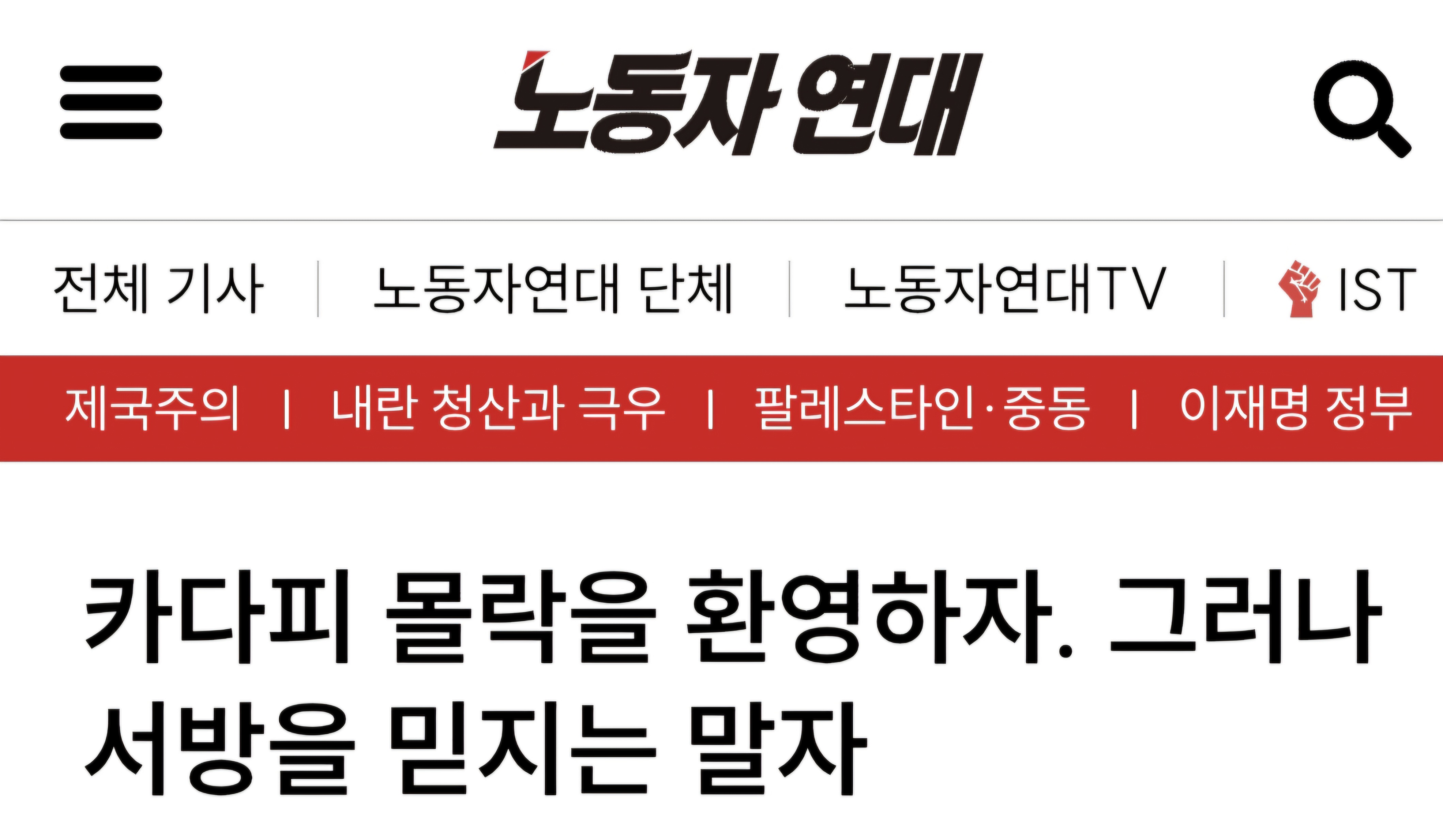 그런데 리비아, 시리아 정권 전복이라는 재앙을 겪고도 일부 정치세력들은 진보진영이라고 자처하면서도 이 심각한 과오를 답습하고 있다. 이는 전술적 판단 실수가 아니라 타락한 정치노선의 근본 오류로부터 기인한다.