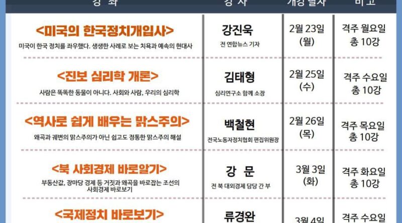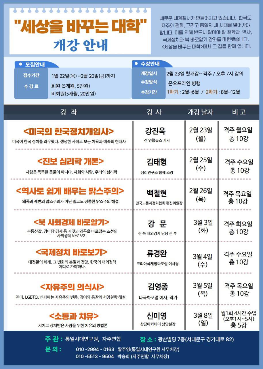 “세상을 바꾸는 대학”강좌 신청서 2026년 1월 24일2026년 1월 24일 노정협 “세상을 바꾸는 대학”강좌 신청서 입니다 아래 링크에 들어가셔서 원하시는 강좌를 신청해 주시기 바랍니다 https://docs.google.com/forms/d/e/1FAIpQLSfpcgWsNeSgCExV4WL9KMzN4cVT9cJbSVha3i994a5VTwAANw/viewform?usp=header 이 기사를 총 7번 보았습니다.