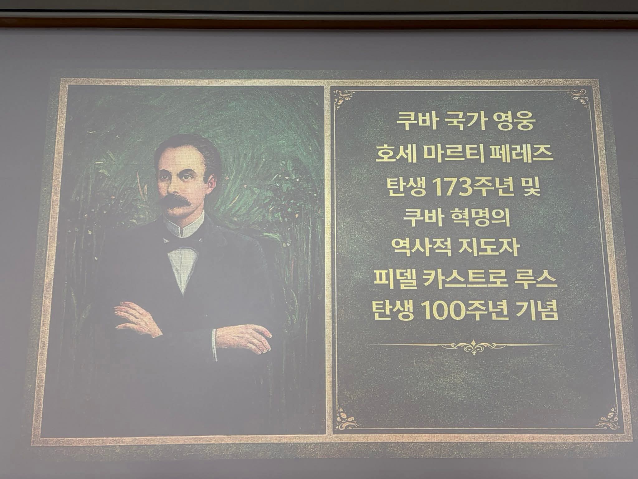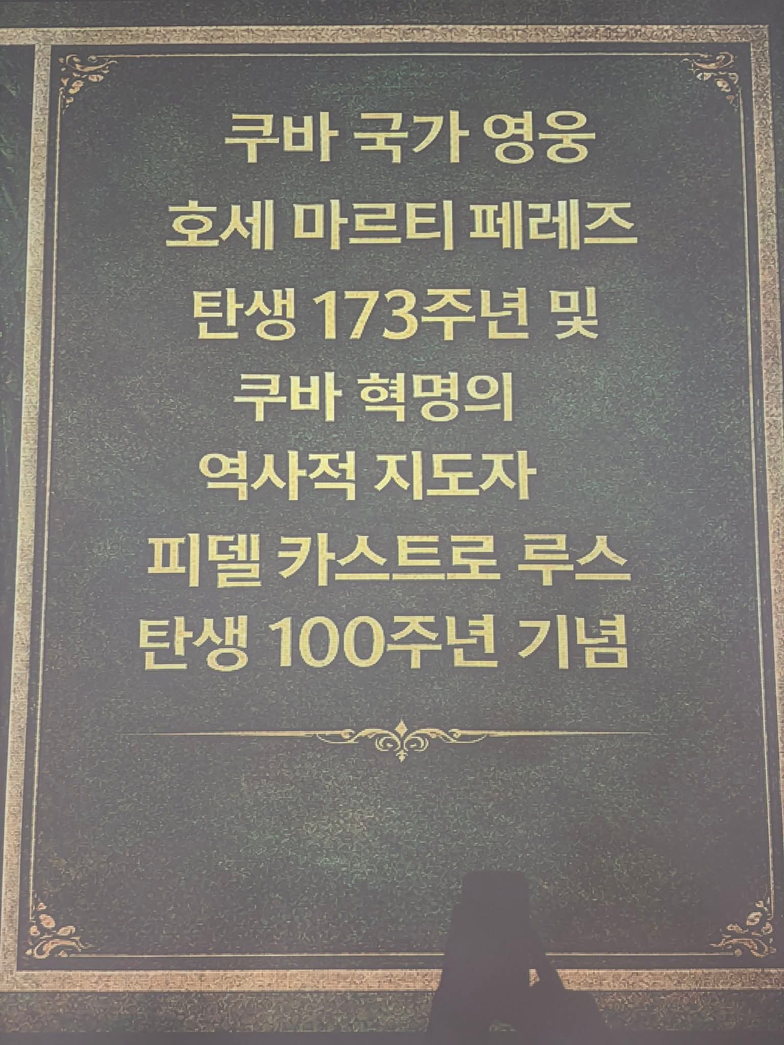 지난 1월 28일(수) 주한쿠바대사관 초청으로 “호세 마르티 탄생 173주년 및 피델 카스트로 탄생 100주년 기념행사”에 외민동 차원으로 참석했다. 한국쿠바친선협회 안내로 초대 받은 것으로 안다.