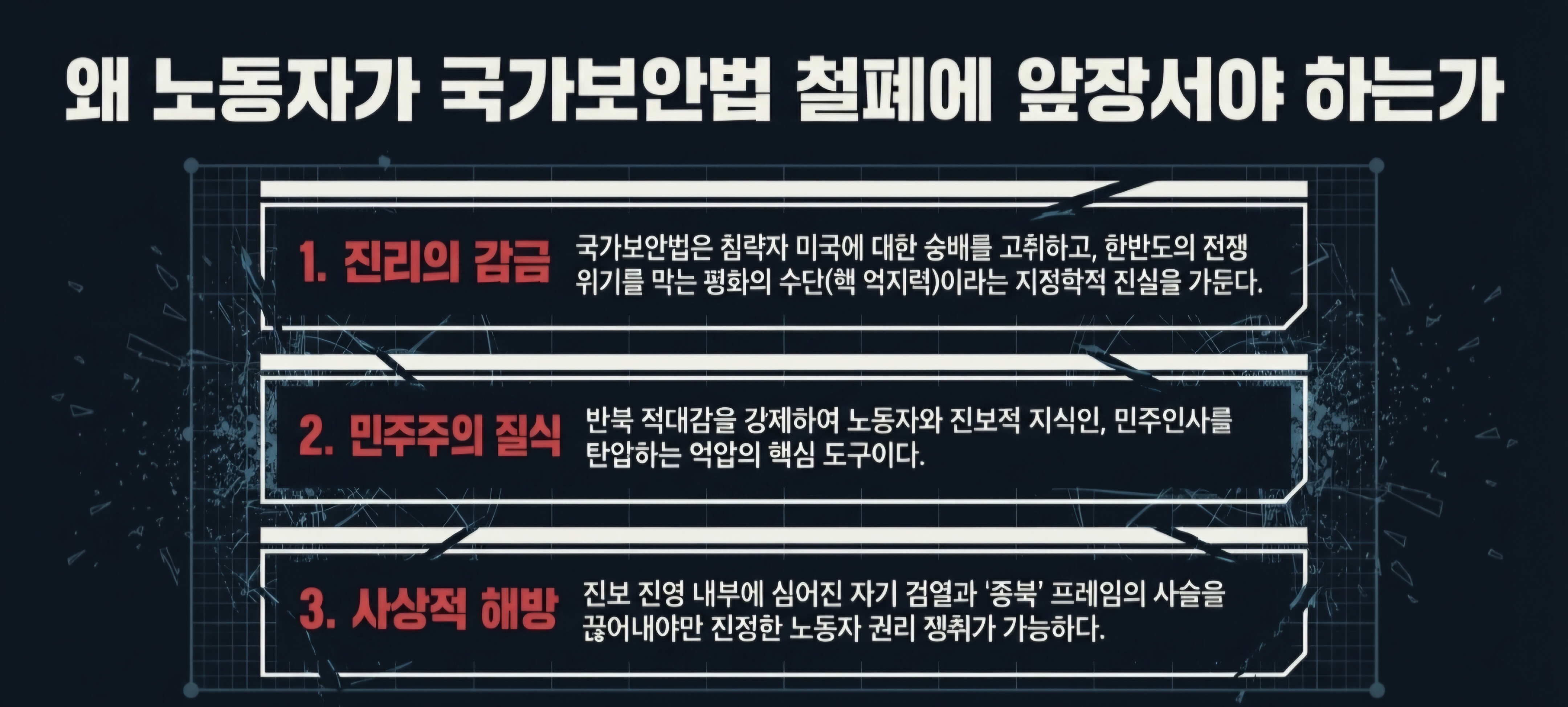 국가보안법은 이 자명한 진리를 가두고 반북 적대감과 침략자 미국에 대한 숭배감을 고취시키고 있습니다. 분단의 장벽을 높이 쌓고 있습니다. 이는 노동자와 진보적 지식인들, 민주인사들을 탄압하여 노동자 권리와 민주주의를 억압하고 질식시키는 수단이기도 합니다. 노동자들이 국가보안법을 철폐하기 위해 앞장서야 하는 이유입니다.